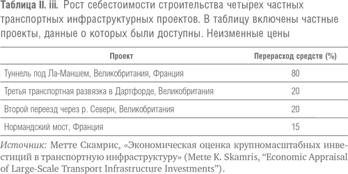 Тогда как схемы перерасхода средств часто поразительно похожи во многих проектах, причины превышения запланированных расходов обычно различаются. Что касается туннеля под Ла-Маншем, то главной причиной перерасхода средств там стали изменения требований безопасности. В проекте транспортного сообщения Большой Бельт причиной раздутого бюджета стали экологические проблемы и аварии, вызванные наводнениями и сильнейшими пожарами. Транспортное сообщение Эресунд оказалось более дорогостоящим, чем планировалось, из-за необходимости вписать новую крупную транспортную инфраструктуру в густонаселенный Копенгаген, а также другие расходы. Что именно вызывает превышение расходов в крупных инфраструктурных проектах гораздо более сложно предсказать, чем тот факт, что перерасход средств, скорее всего, будет преследовать проекты. Но знание самого факта неизбежности перерасхода средств – необходимая и важная отправная точка для анализа риска и управления им, которую мы отстаиваем в этой книге, и которой сегодня очень не хватает в планировании большинства крупных инфраструктурных проектов. Поэтому на этой стадии нас больше интересует констатация факта неизбежности перерасхода средств, чем причина этого явления.