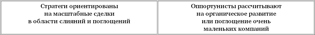 Обнаружив малый бизнес, который можно поглотить, чтобы быстро получить дополнительный доход, оппортунисты могут усмотреть в этом тактическую возможность и быстро ею воспользоваться. Серьезные же слияния и поглощения являются для них очевидно стратегической и потому спорной задумкой, которая отвлекает от гибкого тактического развития. Кроме всего прочего, слияния делают компанию менее интегрированной и тем самым понижают ее способность оперативно реагировать на изменения. Оппортунисты предпочитают не слишком быстрое стабильное органическое развитие, опирающееся только на рост собственного ресурса.