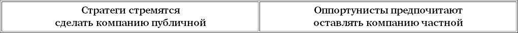 Можно провести и более широкую аналогию. Стратеги живут идеями. Идеи требуют публичных площадок. Стратеги гордятся идеями и продают идеи инвесторам. Биржа становится рынком идей – отсюда берутся бешеные ралли индексов; реальный бизнес не может дорожать и дешеветь с такой скоростью, в отличие от веры в силу идей. Оппортунисты живут практическими делами и деньгами. И то и другое лучше делать вдали от чужих любопытных глаз. И потому оппортунисты тяготеют к сохранению частного характера компании.