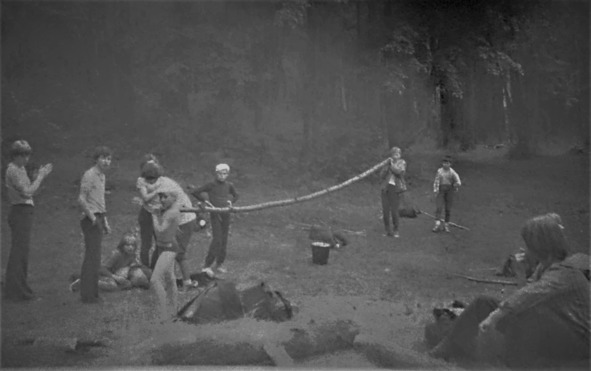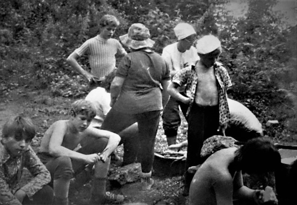 После утомительной ходьбы погружение ног в холодную, напитанную родниками воду, показалось наивысшим блаженством, правда вода, после нашего массового входа прямо в одежде и обуви, превратилась в мутную субстанцию, а со стороны – это напомнило картинку «стадо на водопое». Почувствовав окончание сегодняшнего пути и возможность расслабиться, мы мокрые и довольные развалились на песчаном пляже, но вечный релакс, вдруг, свернулся в одно мгновение, а голос Михалыча – нашего воспитателя, вернул нас на землю. Она, в смысле – земля, оказалась заваленная шишками и сухими ветками, на нее невозможно было растянуть наши палатки. Пришлось взяться за импровизированные веники из свежих сломанных веток и вымести площадку под палатки. Потом, женская часть отряда осталась подготавливать с Михалычем костровище и уже ставить котлы с водой на подготовку ужина, а все пацаны разбрелись по ближним окрестностям собирать валежник для костра.