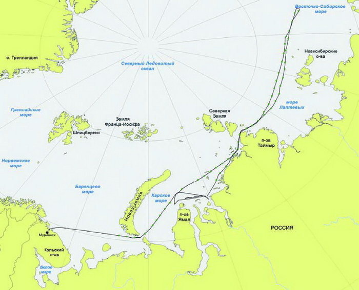 Первая экспедиция проводилась на а/л «Арктика» по маршруту п. Мурманск – Двинский залив – Кандалакшский залив – м. Желания – Енисейский залив – м. Желания – о. Диксон – Енисейский залив – м. Желания – п. Мурманск (рис. 2), в период с 28 февраля по 1 апреля 2007 года на а/л «Арктика». Вторая экспедиция проводилась по маршруту п. Мурманск – Печорское море – пр. Карские ворота – м. Желания – Енисейский залив – о. Диксон – Енисейский залив – м. Желания – п. Мурманск (рис. 3), в период с 18 июня по 10 июля 2007 года на а/л «50 лет Победы». Маршрут третьей экспедиции на а/л «Арктика», самой масштабной по своей протяженности, проходил через акватории сразу четырех арктических морей: Баренцева, Карского, Лаптевых и Восточно-Сибирского (рис. 4).