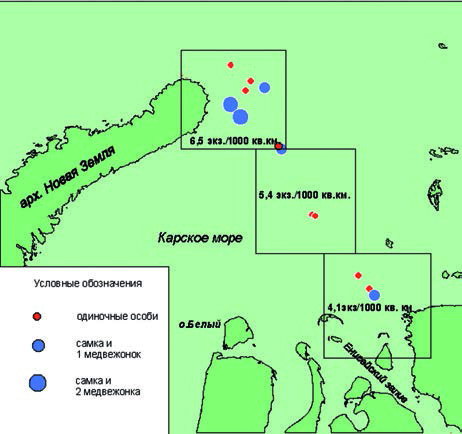 В центральной части Карского и северо-восточной части Баренцева моря отмечены 22 особи в 14 встречах и 131 след белых медведей, что с учетом отработанных километров наблюдений соответствует 6,3 следа на 100 км маршрута и 5 особям на 1000 км