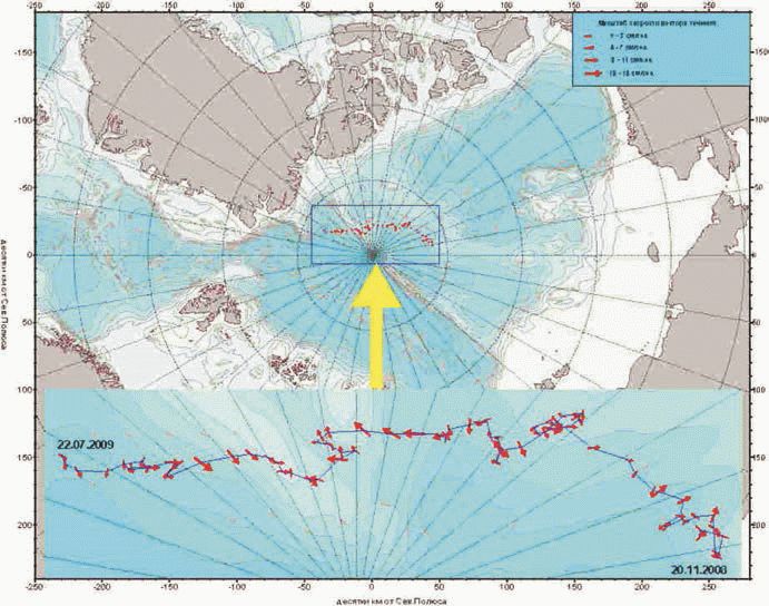 При расстановке профилографов WHS300 и WHLS75 следует иметь в виду возможность наложения сигналов разной частоты, приводящего к сбоям. Как показала практика работ на СП, для исключения наложения сигналов следует разносить измерители на расстояние не менее 50 м. В качестве примера использования данных измерения течения профилографом WHS300 может служить представление пространственного распределения средних векторов (трехсуточное осреднение) течений на горизонте 69 м, полученное в ходе экспедиции СП-36, приведенное на рис. 3.