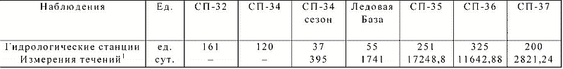Качественный и количественный прорыв в приборной базе, используемой при проведении океанологических исследований в Арктике, наиболее очевиден на примере экспедиций на научно-исследовательских дрейфующих станциях «Северный полюс», организуемых ААНИИ (табл. 6). Увеличение приборной базы по номенклатуре и по количеству измеряемых этими приборами океанологических параметров имело место, начиная с работ сезонного отряда дрейфующей станции СП-34 в 2006 г. Нарастание объема выполняемых наблюдений связанное с расширением приборной базы видно из табл. 7, где показан объем наблюдений, выполненных в тех же экспедициях, что и указанные в табл. 6. При этом если количество гидрологических станций определяется продолжительностью работ на каждой из СП, то объем выполненных измерений течений в большей степени связан с указанными выше тенденциями. Значительный спад количества данных наблюдений на дрейфующей станции СП-37 определяется субъективными причинами.