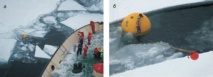 Рис. 3. Подъем притопленной буйковой станции в условиях высокой сплоченности льда в районе постановки ПБС (а, б)