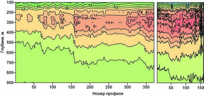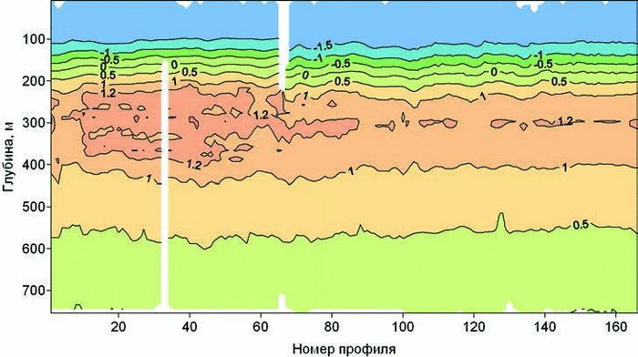 Наиболее интересные результаты могут быть получены при использовании профилографов, перемещающихся вдоль несущего троса ПБС. Пример записи изменений вертикального профиля температуры в северной части моря Лаптевых показан на рис. 4. В частности, благодаря использованию технологии профилирования удалось установить ряд интересных особенностей динамики и термохалинной изменчивости глубинной атлантической водной массы в этом районе и зафиксировать существенный рост температур в ядре Атлантических вод в 2003–2004 гг.