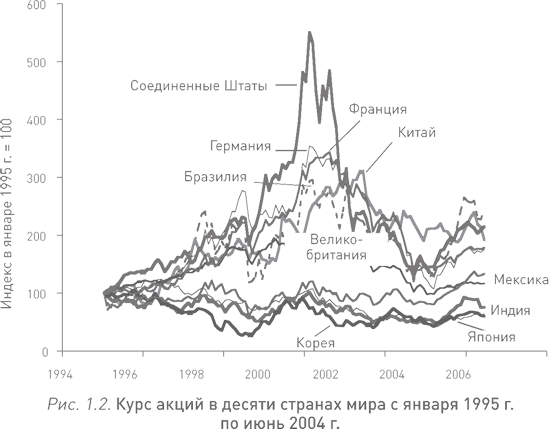Примерно в то же самое время существенный рост курсов акций произошел во многих других странах, и фондовые рынки этих стран достигли пика почти одновременно – в начале 2000 г. На рис. 1.2 показаны цены на акции в десяти странах. Как видно из графика, за период с 1995 по 2000 г. реальные показатели фондового рынка Бразилии, Франции, Китая и Германии почти утроились, в то время как в Великобритании едва удвоились. В 1999 г., за год до пика, средний темп реального роста курса акций в указанных десяти странах составил 58 %. В том же году все страны испытали резкий скачок курса акций, и даже в Великобритании, где он был самым маленьким, он все равно оставался внушительным (16 %). В течение 1999 г. фондовые рынки Азии (Гонконг, Индонезия, Япония, Малайзия, Сингапур и Южная Корея) и Латинской Америки (Чили и Мексика) также заработали огромную прибыль. Это был поистине грандиозный бум мирового масштаба.