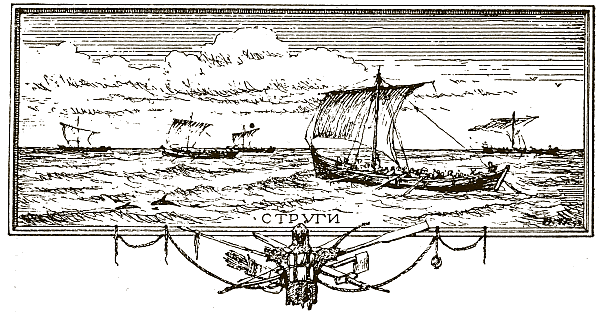 «Сводя все указания, – писал известный историк русского флота Веселаго, – должно остановиться на заключении, что суда, на которых совершались морские плавания первых русских князей (а позднее запорожцев и донских казаков.—Н. 3.), имели однодеревные днища, с приставными к ним набивными досками. Суда эти обыкновенно ходили на веслах, а при попутном ветре пользовались парусом. Сохранившееся многие столетия употребление подобных судов объясняется простотою их постройки, крепостью, поместительностью и другими качествами, удовлетворительными для морских плаваний, а наконец также и легкостью переноски по сухому пути, причем судно могло разбираться на части»[4].