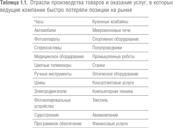 Уроки, на которые указывает Морисон, – элемент гораздо более обширного феномена. Современные менеджеры сталкиваются с теми же проблемами, что и лейтенант Симс сто лет назад. Давайте рассмотрим список отраслей производства товаров и оказания услуг, перечисленных в таблице 1.1. Есть ли между ними что-то общее? На первый взгляд, не слишком много. Чем финансовые услуги похожи на спортивное оборудование? Но есть один тревожный вопрос, характерный для всех этих отраслей. В каждой из них ведущие компании, сталкиваясь с необходимостью быстрых изменений, теряли свои позиции. Производство часов, автомобилей, мотоциклов, шин, спортивной обуви; банки, авиалинии и финансовые компании – во всех этих сферах конкуренция быстро перемещается с местного уровня на международный; длительность цикла разработки продукта стремительно сокращается; качество, системы поставок и сервиса, как и инновации, стали ключевыми конкурентными требованиями. Кроме того, в самых разных отраслях победители слишком часто становятся проигравшими, когда меняются условия товарного класса. Руководителей, которым не удается справиться с новыми условиями конкуренции, намного больше, чем тех, кому это удается (см. таблицу 1.2).