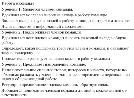 В качестве примера приведена компетенция «работа в команде» с различными индикаторами для каждого иерархического уровня.