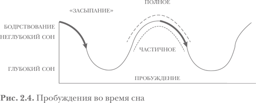 График на рис. 2.4 – упрощенная иллюстрация циклических переходов от глубокого сна к неглубокому, которые в норме возникают у ребенка после четырех месяцев. При частичном пробуждении мы остаемся в состоянии неглубокого сна и не переходим в состояние бодрствования. Но во время полных пробуждений мы можем обнаружить, что смотрим на часы, переворачиваемся с боку на бок, меняем положение руки или чешем ногу. Это состояние бодрствования обычно длится очень недолго, на нас нападает дремота, и мы тут же снова засыпаем.