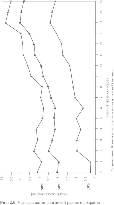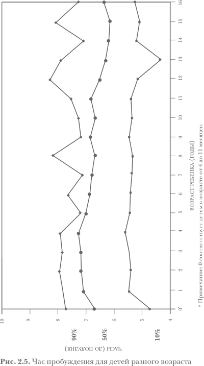 На графиках (рис. 2.5 и 2.6) показано время, когда большинство детей просыпаются и засыпают. Они построены на основе изучения распорядка дня тех же 2019 детей, данные о которых мы использовали при построении графиков (рис. 2.1–2.3). По ним видно, например, что 90 % дошкольников (в возрасте до шести лет) засыпают до 21:00, а 10 % детей в возрасте от двух до шести лет – до 19:00.