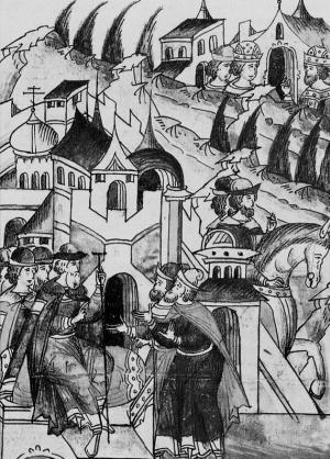 Отправление русских послов в Рим. Миниатюра из Лицевого летописного свода