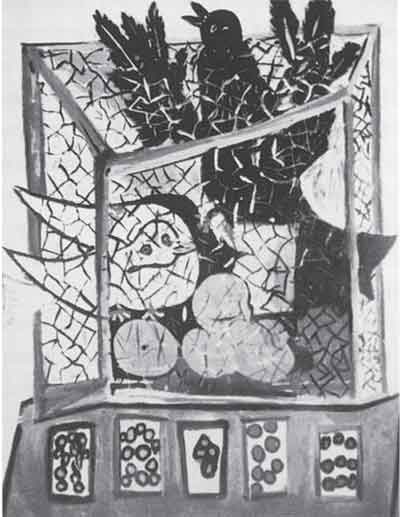 На картине изображена клетка; под ней на зеленом сукне лежат игральные карты; в клетке – белая бедняжка-голубка грустно смотрит на блестящее розовое яблоко. Снаружи около клетки – черная птица; раздраженная, бьющая крыльями, она бросает вызов небу.