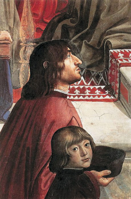Д. Гирландайо. Утверждение устава францисканского ордена папой Гонорием III. 1482–1485 гг. Фрагмент росписи капеллы Сассетти в церкви Санта-Тринита, Флоренция. Семья Медичи – Козимо Старый, его сын Пьетро и внуки Лоренцо, прозванный Великолепным (в центре, с черными волосами), и маленький Джулиано.