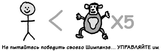 Реальный шимпанзе в пять раз сильнее человеческого существа. Аналогично, наш эмоциональный Шимпанзе в пять раз сильнее нас. Не пытайтесь одолеть его, управляйте им. Вам нужен план управления!
