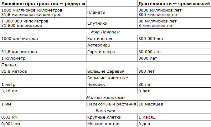 Выраженный просто, третий закон Кеплера видимо предполагает то, что, когда линейное пространство возводится в куб, длительность возводится только в квадрат. С целью продемонстрировать это без сложных вычислений, мы сделаем два параллельных столбца – один, представляющий пространство, в котором каждая ступенька – это умножение на 31,8 (приблизительно π3), другой, представляющий время, в котором такая же ступенька умножена на 10 (приблизительно π2). Левый столбец будет представлять радиусы, а правый – длину жизней. Нашей основой будет человек, и для удобства мы примем продолжительность его жизни за 80 лет, а его радиус (от сердца до кончиков пальцев) за 1 м.