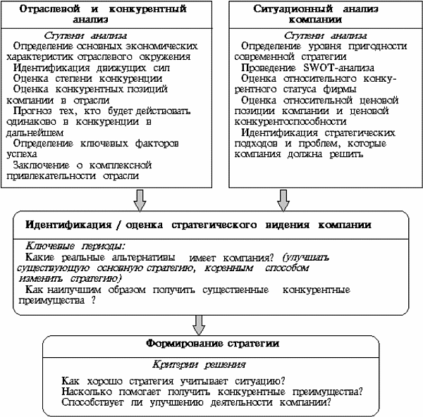 Целью конкурентного анализа является выявление тех черт внутренней и внешней сред компании, которые наиболее выпукло влияют на стратегическое видение и возможности компании. Внимание при этом концентрируется на получении четких ответов на хорошо определенный ряд вопросов по стратегии. Затем эти ответы используются для формирования четкой картины стратегической ситуации компании и определения альтернатив ее стратегических действий.