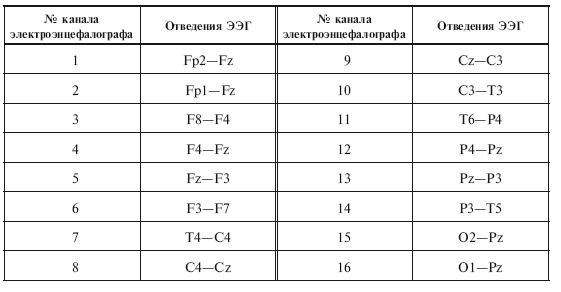 Условные обозначения: F (frontalis) – лобные области, C (centralis) – центральные отделы, T (temporalis) – височные, P (parietalis) – теменные, O (occipitalis) – затылочные. Четная нумерация электродов – в правом полушарии, нечетная – в левом. Электроды сравнения (Ref – А1 и А2)