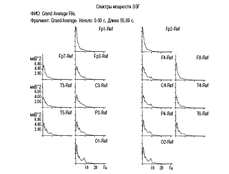Рис. 2.5. Усредненные спектры мощности ЭЭГ обследованных детей с незрелым низкоамплитудным типом (менее 50 мкВ), без теменно-затылочного фокуса альфа-ритма