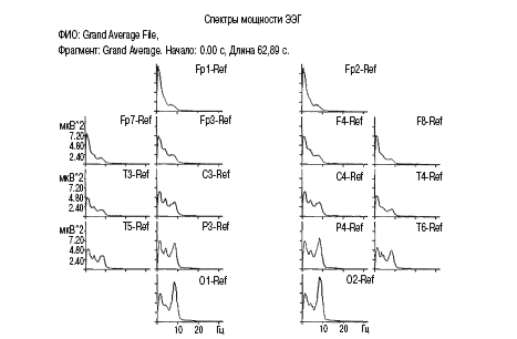 Усредненные спектры мощности ЭЭГ данного типа у обследованных детей представлены на рис. 2.3, где видны спектральные пики около частоты альфа-диапазона – 10 Гц (ось абсцисс), максимально выраженные в затылочных отделах.