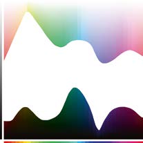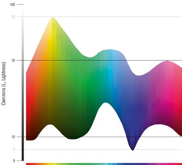 На илл. 2.10 видно, что нижний пик синего цвета приходится на уровень светлоты 3L. Вариации цвета в более темном диапазоне человеческий глаз практически не различает, воспринимая их как черный. Верхний пик желтого цвета приходится на уровень светлоты 95L. Более светлые цвета мы также практически не различаем, воспринимая их как белый. Усредненно по всем цветам диапазон максимального их разнообразия по светлоте и цветовому тону составляет примерно 10–70L.