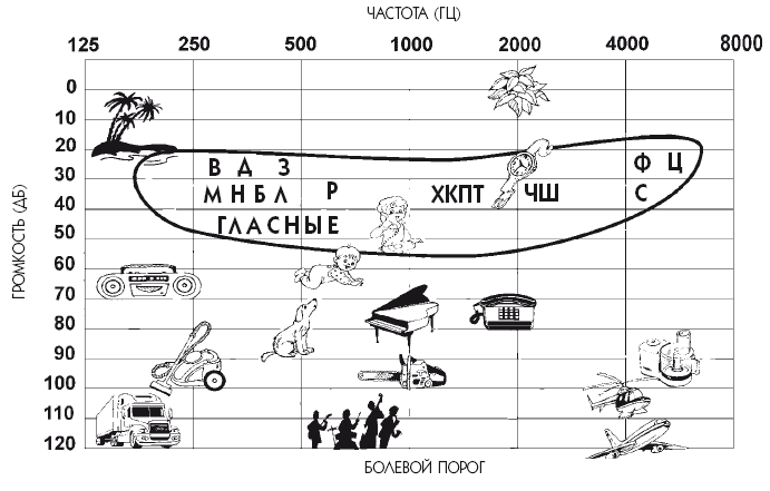 На рис. 2.2. можно сравнить уровень и частоту некоторых окружающих звуков и звуков речи. Здесь также выделена зона, где находится большая часть звуков речи. Эта зона напоминает по форме банан и получила название «речевой банан».