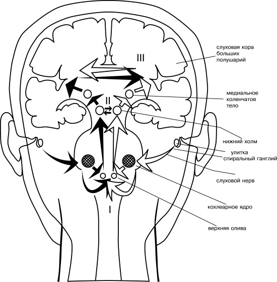 римскими цифрами обозначены структуры, соединяющие симметричные подкорковые и корковые центры двух полушарий мозга: I – нервные волокна от верхних олив к кохлеарному ядру противоположной стороны (обеспечивают бинауральное взаимодействие и правильную локализацию источника звука в пространстве); II – комиссура верхних бугров четверохолмия (обеспечивает координацию движений глаз, головы, тела при локализации звука), III – мозолистое тело (соединяет корковые отделы двух полушарий мозга и обеспечивает их взаимодействие).