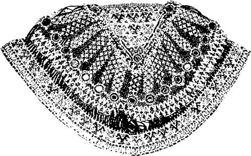 Рис. 11. Женский нагрудник из бисера с изображением дисков утреннего, дневного и вечернего солнца и голов коней, смотрящих в разные стороны