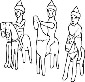 Рис. 12. Конные воины в шлемах. Дерево. Обратите внимание: первый воин сидит на коне, имеющем две головы