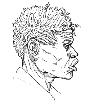На рисунке 9 мы видим лицо бушмена в профиль. Здесь хорошо заметно своеобразие антропологического типа лица. Длинная челюсть сочетается с альвеолярным прогнатизмом, коротким уплощенным носом. Мозговой череп небольшой по объему. Ухо расположено ближе к затылку. На ухе можно рассмотреть так называемый «дарвиновский бугорок». Глаза глубоко посажены. На мой взгляд, в лице данного бушмена заметны признаки вырождения антропологического типа. Повышенная морщинистость кожи подтверждает это предположение.