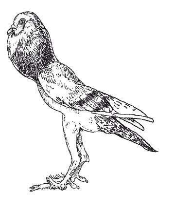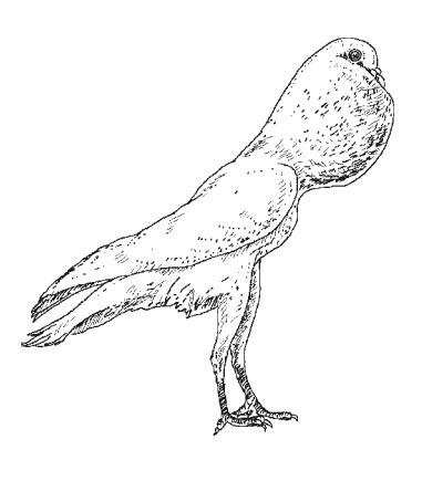 Как уже упоминалось, у этих голубей прямая стойка, стройная фигура и длинные ноги. В предпяточной части ноги голые, красные. Длина их от коленного сустава до конца среднего пальца около 130170 мм; поставлены они должны быть как можно уже.