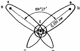 В молекуле воды ядра атомов водорода и кислорода образуют равнобедренный треугольник. В вершине его – сравнительно крупное кислородное ядро, в углах – по одному ядру водорода. В соответствии с электронным строением атомов водорода и кислорода молекула воды располагает пятью электронными парами, которые образуют электронное облако. Оно неоднородно. У кислородного ядра создается избыток электронной плотности. Внутренняя электронная пара кислорода равномерно обрамляет ядро: схематически она представлена окружностью с центром – ядром O