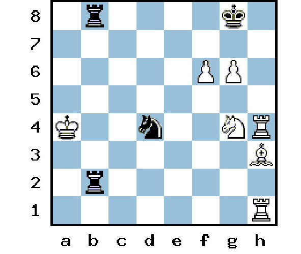 Игра шла яростная и отчаянная. Наконец, на доске возникла следующая позиция (см. диаграмму 4). Казалось, ещё немного, и король белых, которыми играл купец, вынужден будет сдаться. В отчаянии, он кинул прощальный взгляд на драгоценную Диларам.