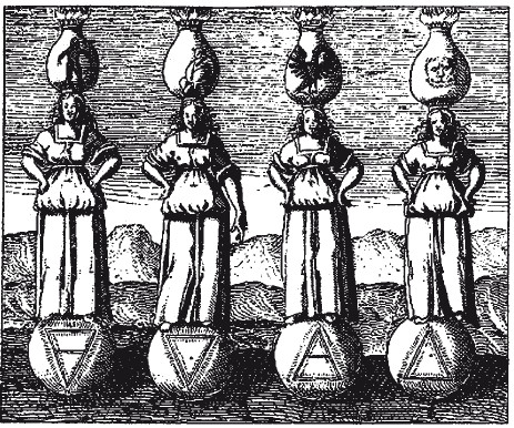 На гравюре Йоганна Милиуса (Mylius J.D. Philosophia reformata. Frankfurt, 1622. Pl. 17) аллегорические изображения четырех стихий поддерживают кипящие сосуды с эмблемами четырех основных стадий алхимической трансмутации – nigredo, albedo, citrinitas и rubedo (чернение, беление, желтение, краснение). Процесс этот трактовался не только как цикл преобразований вещества, но и как ряд ступеней в духовном совершенствовании экспериментатора.