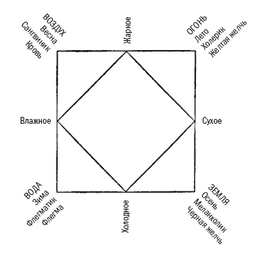 Четырехэлементная схема, впервые письменно зафиксированная во времена Эмпедокла, устанавливает соответствие между: а) базовыми составляющими открытого ландшафта (земля, вода, воздух, источники света); б) внутренним составом вещества; в) телесными ощущениями; г) сезонами года; д) основными типами человеческого темперамента; и е) телесными субстанциями. Таким образом, она обеспечивает связь между теми содержаниями опыта, которые позднее были разделены на области «внешнего» (предмет математического естествознания) и «внутреннего» (предмет психологии и гуманитарных наук).