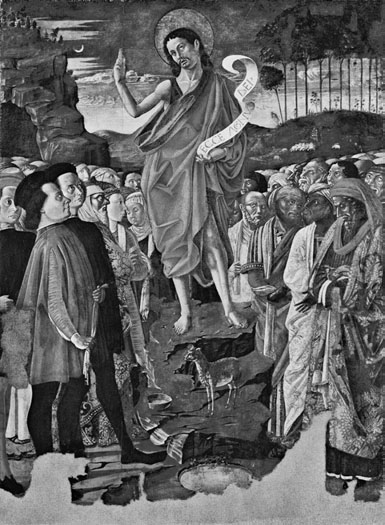 Рис. 1.5. Хоругвь «Проповедь Иоанна Крестителя» из Ораторио Сан Джованни, Урбино. Некоторые итальянские историки считают, что в толпе слушателей изображены Виссарион и Софья Палеолог: 3-я и 4-я фигуры слева. Галерея провинции Марке. Урбино. Взято из Интернета.