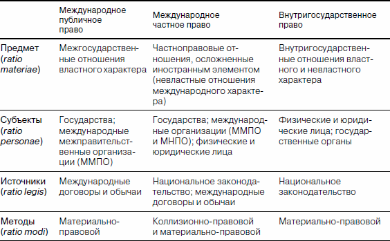 Завершая главу о предмете, методе, субъектах и источниках МЧП, предложим следующее определение: МЧП – это полисистемный комплекс (дуалистичная система), объединяющий нормы различной правовой природы и характера, которые содержатся в национальном законодательстве, международных договорах и обычаях, регулирующий осложненные иностранным элементом (международные) коллизионные, материальные (частноправового характера) и процессуальные (тесно связанные с частноправовой сферой) отношения с помощью коллизионного и субстантивного методов. Соотношение МЧП с международным публичным и внутригосударственным правом можно представить в виде таблицы (табл. 2).