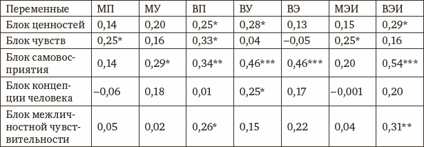 Очевидно, что внутриличностный эмоциональный интеллект образует положительные (умеренные или средние) взаимосвязи с «блоками» самовосприятия и межличностной чувствительности. Это означает, что ВЭИ в целом способствует принятию своих индивидуальных особенностей и позитивному самовосприятию. Позитивное самоотношение, в свою очередь, способствует установлению глубоких и тесных взаимоотношений с другими людьми. Понимание собственных эмоций связано с естественностью их проявления (положительная взаимосвязь переменной ВП и «блока чувств»).