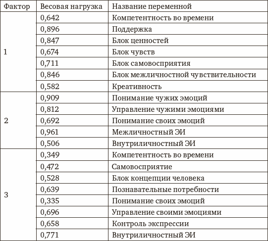 На третьем этапе исследования факторному анализу были подвергнуты результаты, полученные на выборке в целом без учета гендерных различий. Переменные эмоционального интеллекта и самоактуализации составили три фактора, которые были извлечены при помощи факторного анализа (метод главных компонент, вращение по модели варимакс) (таблица 3).