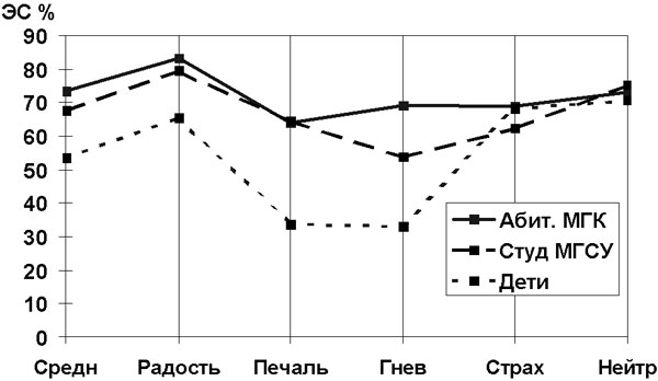 Таким образом, в целом представители художественного типа личности отличаются от мыслительного более высокой эмоциональной импрессивностью (высоким уровнем ЭС) и большей адекватностью восприятия разных эмоциональных контекстов речи. Введенный нами новый показатель ЭС – коэффициент вариативности (σ/М. 100 %) уровня восприятия разных эмоций – может быть использован в комплексе с другими показателями в качестве одного из критериев принадлежности респондента к художественному типу личности, что немаловажно при профотборе и социальной профориентации людей.