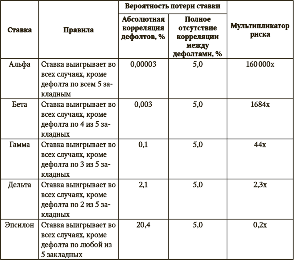 Самая безопасная ставка, которую я назову «Альфа», принесет вам деньги во всех случаях, кроме одного: когда дефолту подвергнутся все пять закладных. Самая рискованная – «Эпсилон» – лишает вас денег, если дефолту подвергается любая из закладных. Все остальные варианты могут считаться промежуточными.