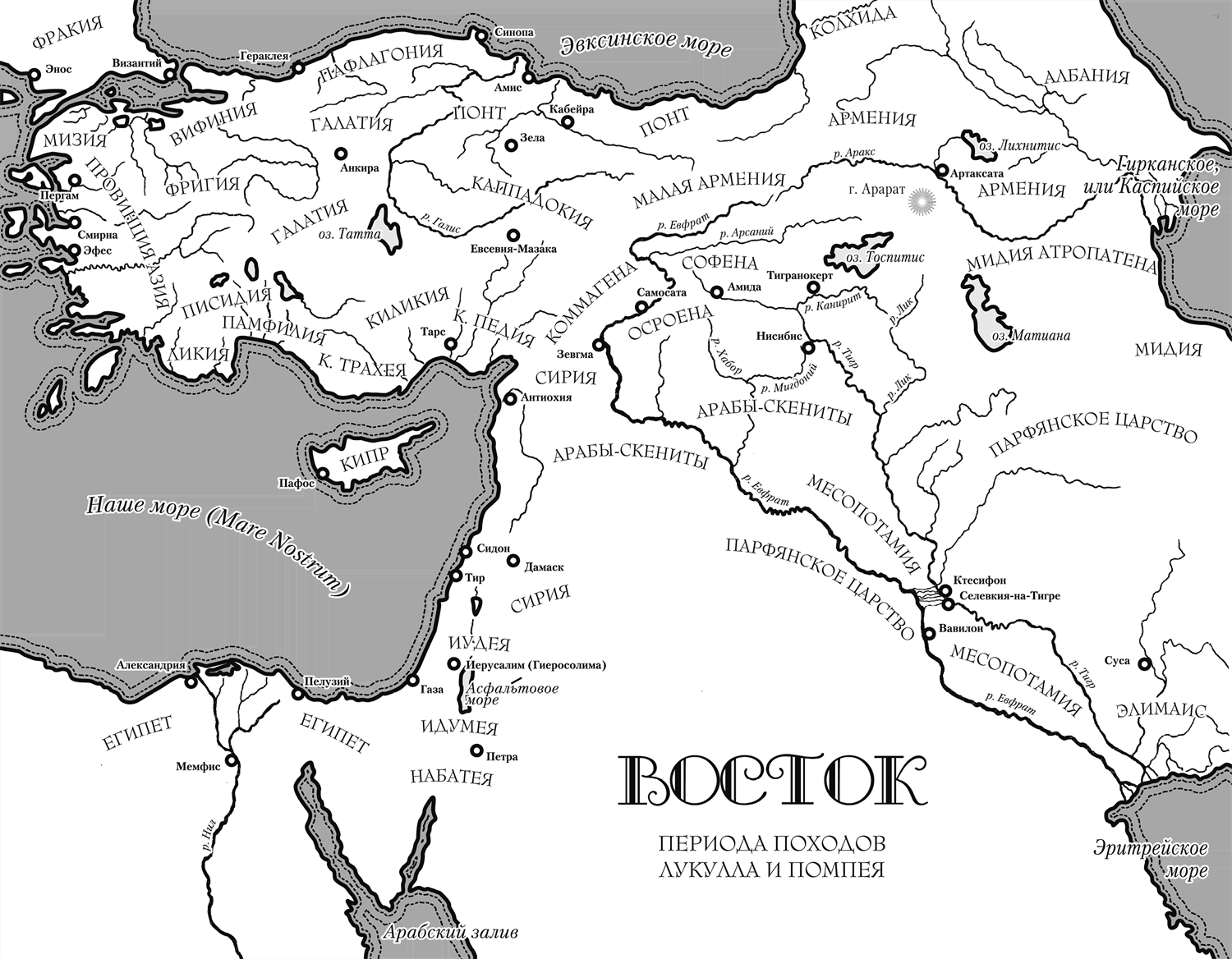 Два года назад царь Митридат бежал ко двору своего зятя Тиграна. Он не смог состязаться с римской военной мощью, остро чувствуя утрату четвертьмиллионного опытного войска, которое он потерял на Кавказе в бессмысленной карательной экспедиции против албанских дикарей, опустошавших Колхиду. Митридату потребовалось двадцать месяцев, чтобы убедить Тиграна увидеться с ним, и еще больше – чтобы убедить того помочь ему вернуть утраченные земли Понта, Каппадокии, Малой Армении и Галатии.