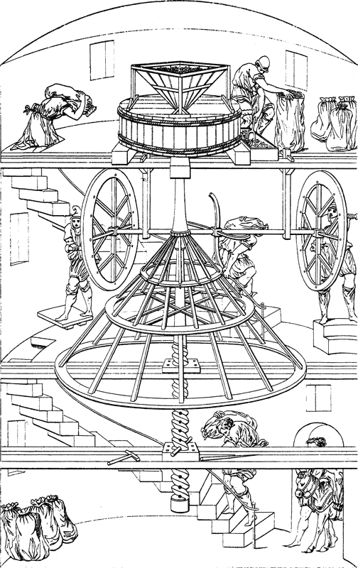 Впоследствии мельничный механизм претерпел важные модификации. Мы имеем в виду гидравлические мельницы, дата появления которых в Италии точно не известна, хотя Помпоний Сабин утверждает (но бездоказательно), что это открытие свершилось во время правления Юлия Цезаря. Такие мельницы существовали в Риме во времена императора Августа, и о них упоминает Витрувий. Спустя более чем шестьдесят лет Плиний говорит о них как о редких и необыкновенных приспособлениях.