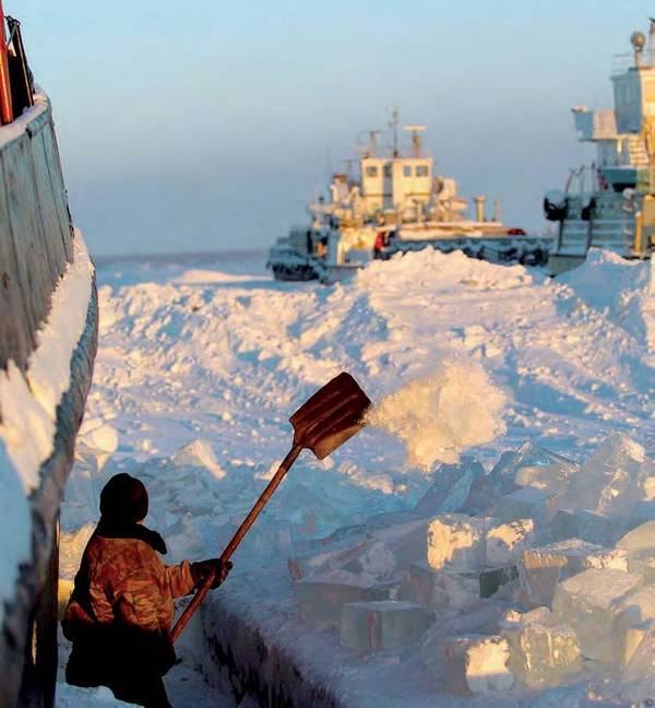 Порт Хатанга скован льдом семь месяцев в году (на фото освобождают ото льда винты судна).