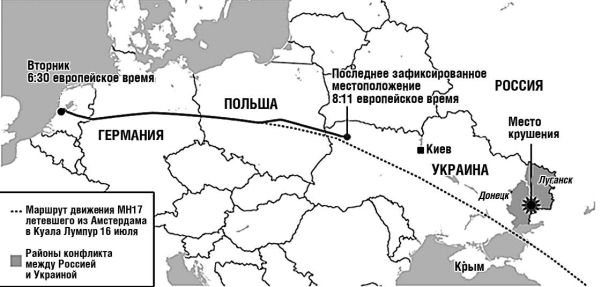Рис. 4. Маршрут рейса МН 17 16 июля и место нахождения обломков