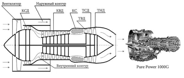 На этом «Боинге 777» были установлены турбореактивные двухконтурные двигатели, разработанные компанией «Роллс-Ройс», – «Rolls-Royce Trent 800» весом 7,5 тонн и тягой в 42 тонны каждый. Диаметр вентилятора двигателя (того, что видно спереди) – 2,8 метра. Схема двухконтурного турбореактивного двигателя дана на рис. 15.