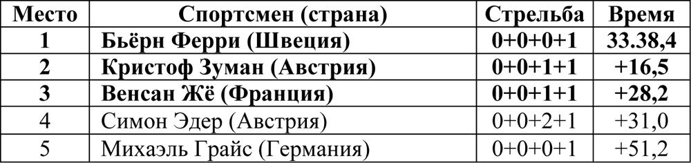 Стартовавшие первыми Венсан Жё и Эмиль Хегле Свендсен пришли на первый огневой рубеж одновременно и отстреляли без промахов. Шедший с небольшим отставанием Яков Фак допустил два промаха и потерял шансы на медали. На втором огневом рубеже Жё снова отстрелял чисто, а Свендсен промахнулся. С отставанием на 25 секунд от Жё на дистанцию ушли Свендсен и не допустивший промахов Клемен Бауэр, а за ними с отставанием ещё на 20–30 секунд ушла большая группа участников, в которую, в частности, входили Бьёрн Ферри, Кристоф Зуман и Уле-Эйнар Бьёрндален. На третьем рубеже Свендсен и Бауэр промахнулись по два раза, Жё – один раз, и сразу за ним, с двухсекундным отставанием, ушёл на дистанцию оттстрелявший без ошибок Ферри, а ещё через 17 секунд – Бьёрндален и Зуман. Наконец, на четвёртом рубеже Бьёрндален допустил два промаха и потерял шансы на медаль, а Ферри, Жё и Зуман – по одному. Ферри ушёл на дистанцию первым и без проблем добрался до финиша, став олимпийским чемпионом. Жё потерял все силы, и его легко обошёл Зуман, а затем на финишной прямой чуть было не догнал Симон Эдер.