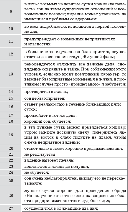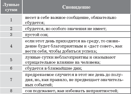 Особенно внимательно следует отнестись к снам, увиденным в дни новолуния, полнолуния, первой и третьей четвертей лунного цикла. Эти периоды заключают в себе критические точки Луны в ее движении относительно Солнца. Сны в критические точки Луны рассказывают о конфликте нашего разума с чувствами, логики – с интуицией.