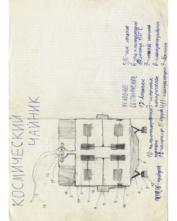 В нашем доме хранится детский карандашный рисунок – проект «космического чайника», сделанный Павликом в восьмилетнем возрасте. Он учился тогда в четвёртом классе, куда он перешёл сразу из первого.